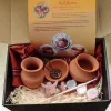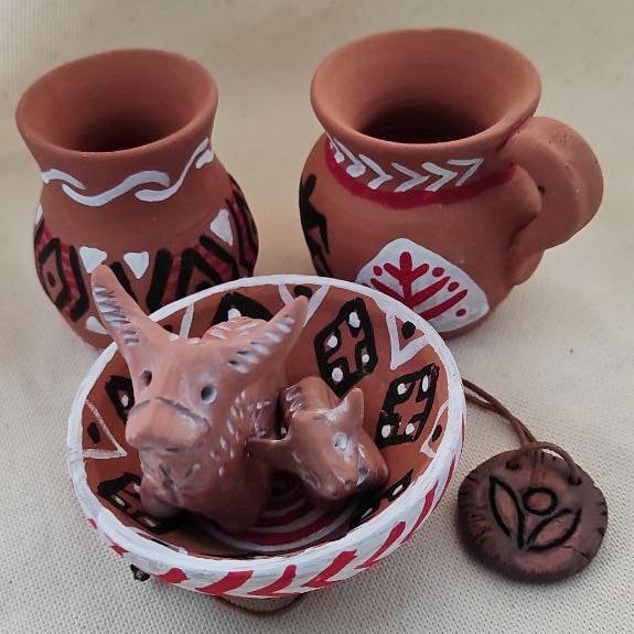 До складу набору входять: - зменшені репліки посуду (два глечики та мисочка), які створені з обпаленої глини; - три контейнери з акриловими фарбами (білою, чорню та червоною) та пензлик із вовни білки; - буклет з описом традиційних трипільських орнаментів і символів та фото зразків розпису; - іграшка-амулет, що зображує маленьке чарівне звірятко (2 шт); - упаковка, яка включає картонну коробку та дерев'яну стружку для збереження глиняного посуду при транспортуванні, мішечки з тканини.