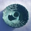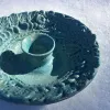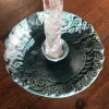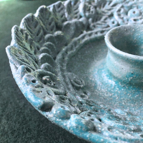 Блакитний пласький свічник на одну свічку. Декоративний глазурований керамічний витвір. Авторська робота. Єдиний екземпляр. Діаметр 15 см., висота 5 см., діаметр свічки 3 см. Об'ємне оздоблення з ефектом криги кожного разу створює оригінальне враження в залежності від освітлення та кута зору.